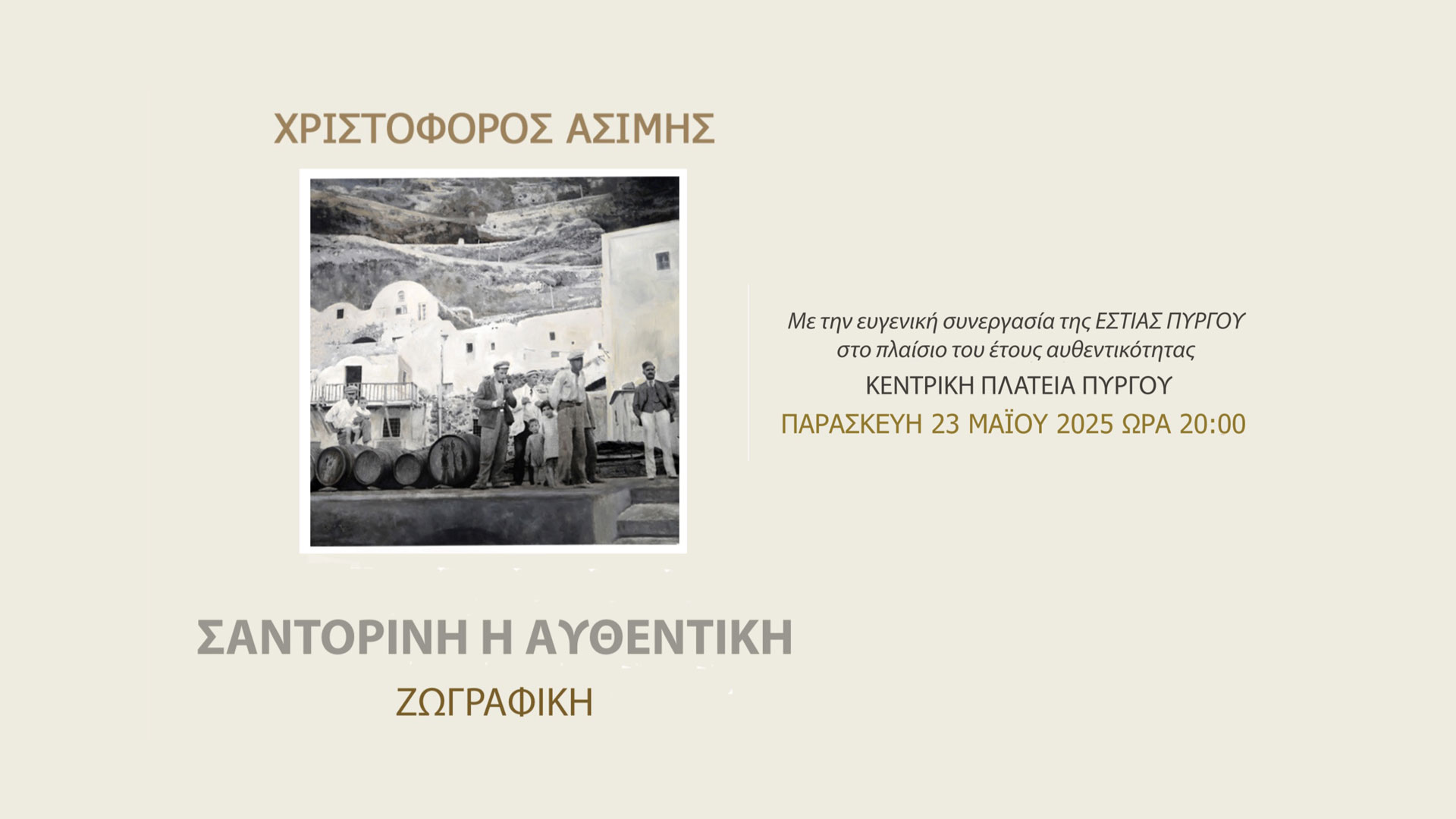 Στο πλαίσιο των εκδηλώσεων της πρωτοβουλίας του Δήμου Θήρας “Σαντορίνη 2025 – Έτος Υποστήριξης και Ανάδειξης της Αυθεντικότητας” η Εστία Πύργου θα φιλοξενήσει, στον εκθεσιακό χώρο της Πλατείας του Πύργου, την έκθεση ζωγραφικής του Θηραίου ζωγράφου Χριστόφορου Ασιμή με θέμα: “Σαντορίνη η αυθεντική”.
