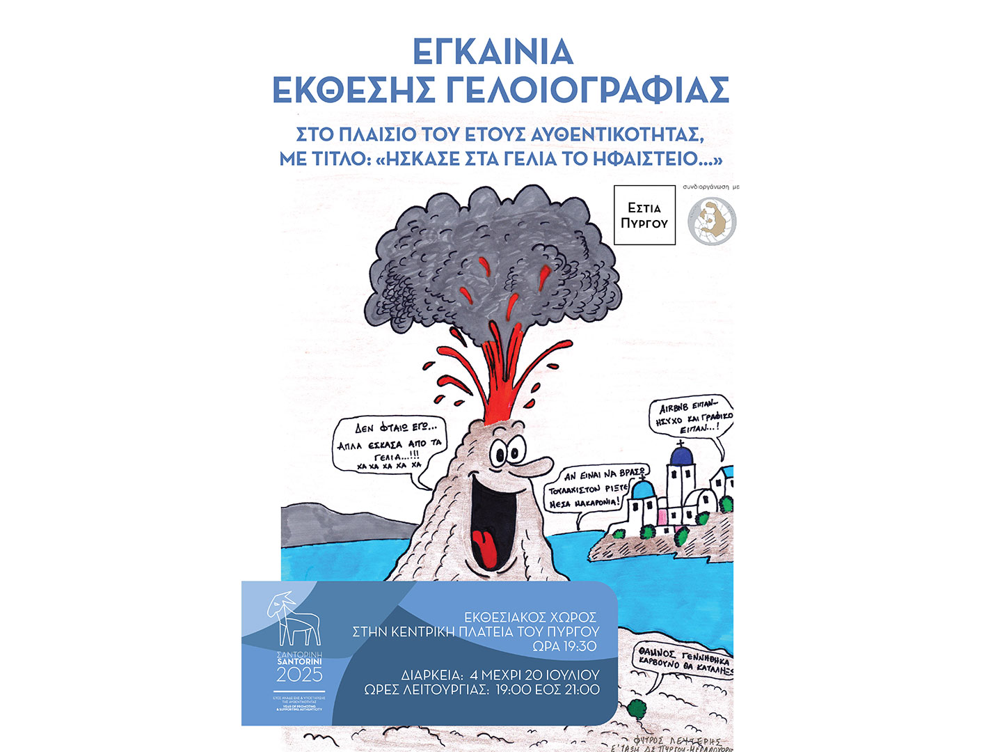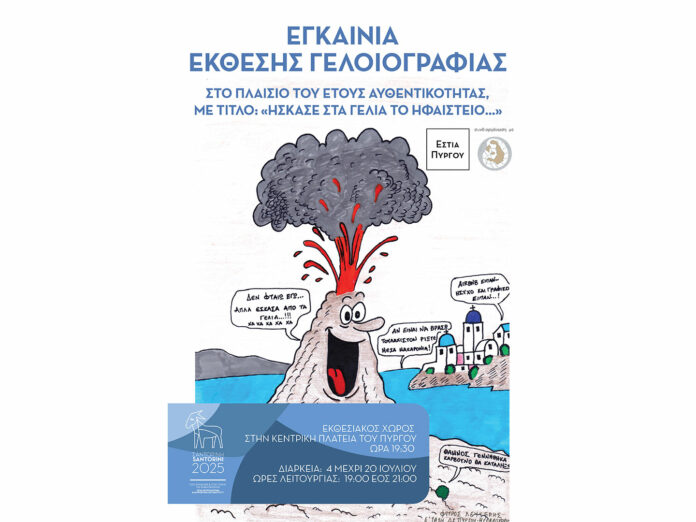 Στο πλαίσιο του Έτους Ανάδειξης και Υποστήριξης της Αυθεντικότητας, ο πολιτιστικός σύλλογος «ΕΣΤΙΑ ΠΥΡΓΟΥ ΚΑΛΛΙΣΤΗΣ», σε συνεργασία με τον Δήμο Θήρας, διοργανώνει την Έκθεση Γελοιογραφίας με τίτλο «Ήσκασε στα γέλια το Ηφαίστειο!», στον εκθεσιακό χώρο της κεντρικής πλατείας του Πύργου.