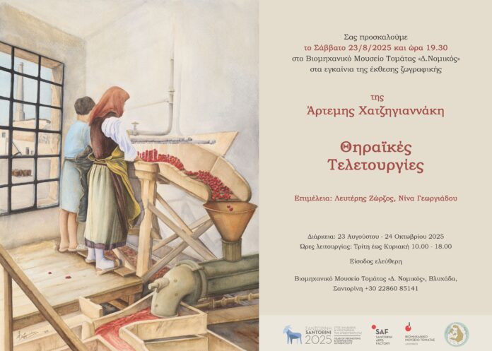 Η Άρτεμις Χατζηγιαννάκη παρουσιάζει τη νέα της ατομική έκθεση ζωγραφικής, με τίτλο “Θηραϊκές Τελετουργίες”, στο Βιομηχανικό Μουσείο Τομάτας Δ. Νομικός στη Βλυχάδα Σαντορίνης, με εγκαίνια στις 23 Αυγούστου. Η έκθεση, που είναι ενταγμένη στην πρωτοβουλία “Σαντορίνη 2025: Έτος Ανάδειξης και Υποστήριξης της Αυθεντικότητας“, περιλαμβάνει 15 υδατογραφίες με θεματικό άξονα τις αθέατες αλλά ενεργές πολιτισμικές καταβολές του νησιού.