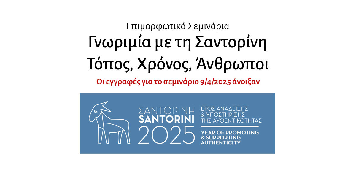 Ο Δήμος Θήρας στο πλαίσιο της πρωτοβουλίας «Σαντορίνη 2025: Έτος Ανάδειξης και Υποστήριξης της Αυθεντικότητας» διοργανώνει μια σειρά επιμορφωτικών σεμιναρίων με τίτλο:
